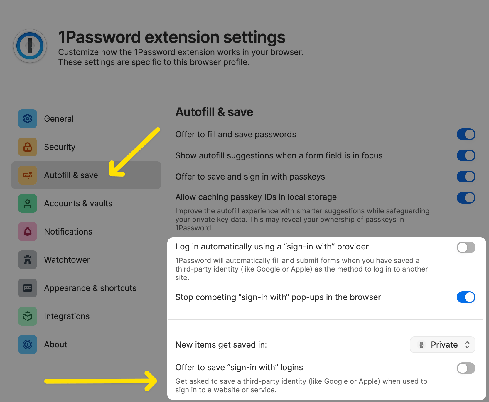 Then it’s these three settings that are related to social sign ins. I don’t mind that 1PWD attempts to stop other sites log in popups, but I flip off the settings related to 1PWD trying to save or offer to help with social login.